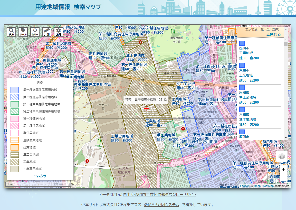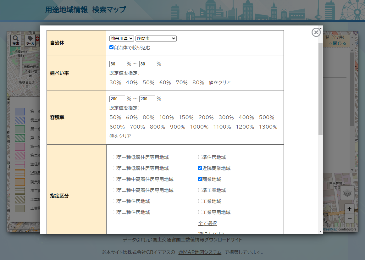 指定区分や建ぺい率・容積率で絞り込むことができます。